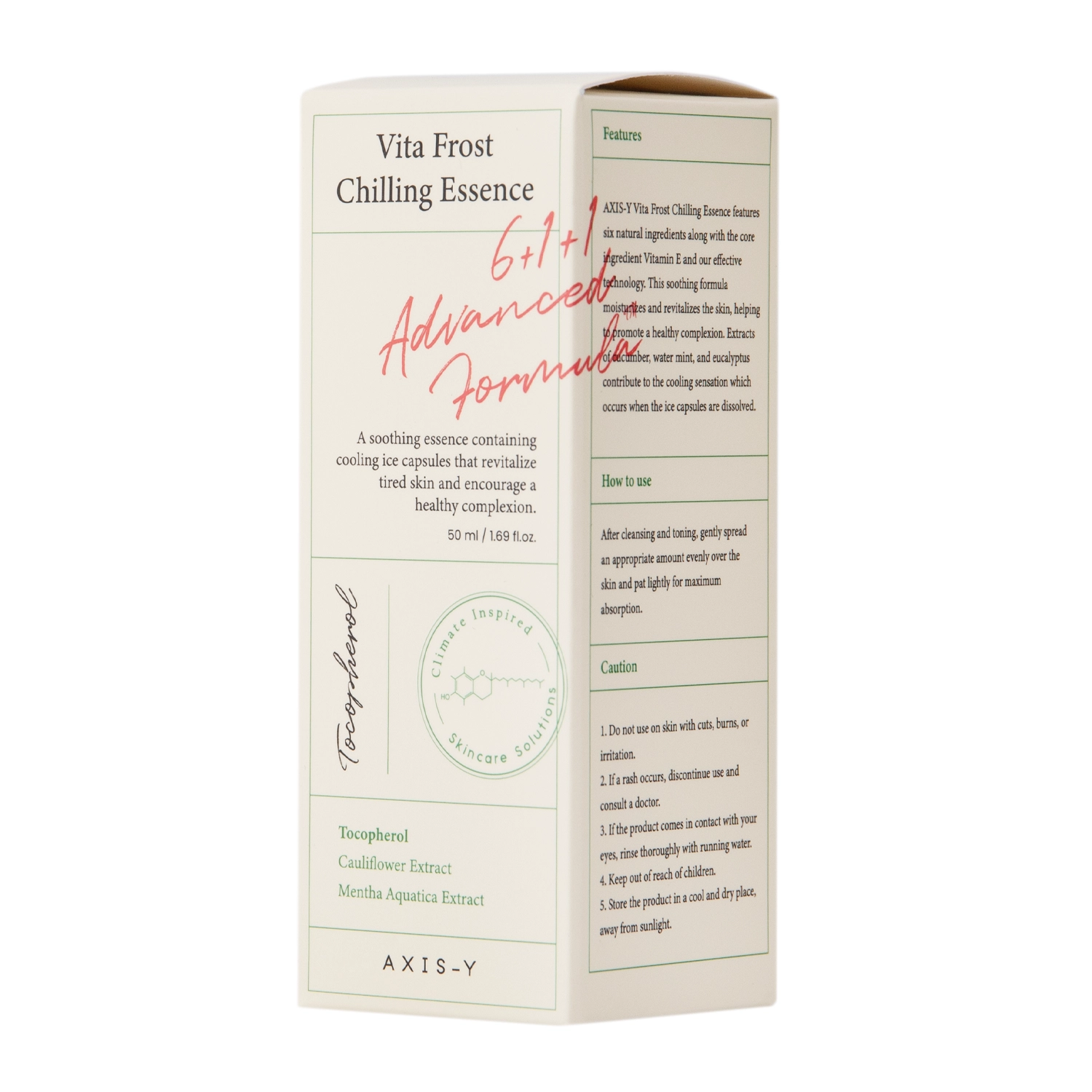 Axis-y - Vita Frost Chilling Essence - eine Gel-Gesichtsessenz, die einen sanften, angenehmen Kühleffekt hat. Sie lindert die gereizte Haut und mildert Rötungen. Sie hat eine leichte Textur, die leicht einzieht. Das Produkt enthält antioxidatives Vitamin E, das in kleinen Kapseln verkapselt ist. Es enthält zahlreiche Pflanzenextrakte, darunter Wasserminze und Eukalyptus, die eine kühlende Wirkung haben. Der Zusatz von Gurkenextrakt hat eine entzündungshemmende und lindernde Wirkung. Das Produkt verschafft gereizter und geröteter Gesichtshaut Linderung. Seine Formel ist vegan und natürlich.