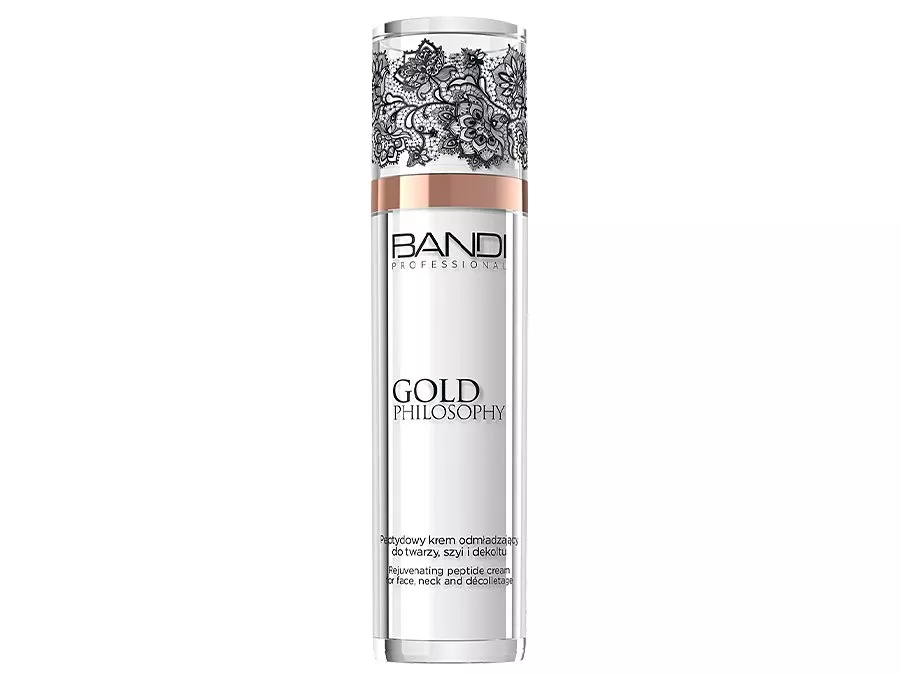 Bandi - Professional - Gold Philosophy - Rejuvenating Peptide Cream - Eine Creme für reife Haut oder Haut mit ersten Anzeichen der Hautalterung. Sie basiert auf innovativen Youth Restore Peptiden, die eine verjüngende Wirkung haben, die Elastizität der Haut verbessern und Falten reduzieren. In Symbiose mit ihnen wirkt Gold, das starke revitalisierende Eigenschaften aufweist und das Erscheinungsbild der Haut verbessert. Die Ölphase der Creme basiert auf sehr leichtem Squalan, das ebenfalls die Penetration fördert, sowie auf Buriti-Öl, das für seine wohltuende Wirkung auf reife Haut bekannt ist.