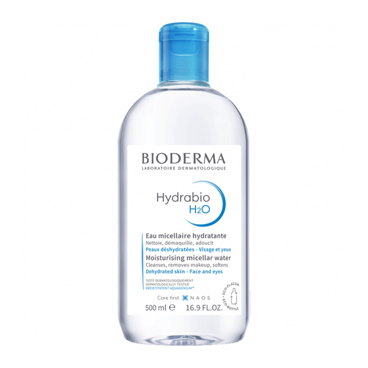 Bioderma - Hydrabio H2O - Mizellenlotion zum Abschminken und Reinigen von trockener, dehydrierter und empfindlicher Haut. Sie enthält das Aquagenium™-Patent, das dafür sorgt, dass Unreinheiten entfernt werden, ohne die Hydrolipidbarriere der Haut zu beeinträchtigen, sodass die Haut ihre Feuchtigkeit nicht verliert. Darüber hinaus wurde sie mit Zucker, Niacinamid sowie Gurken- und Apfelextrakten angereichert, die der Haut Feuchtigkeit spenden und sie beruhigen.