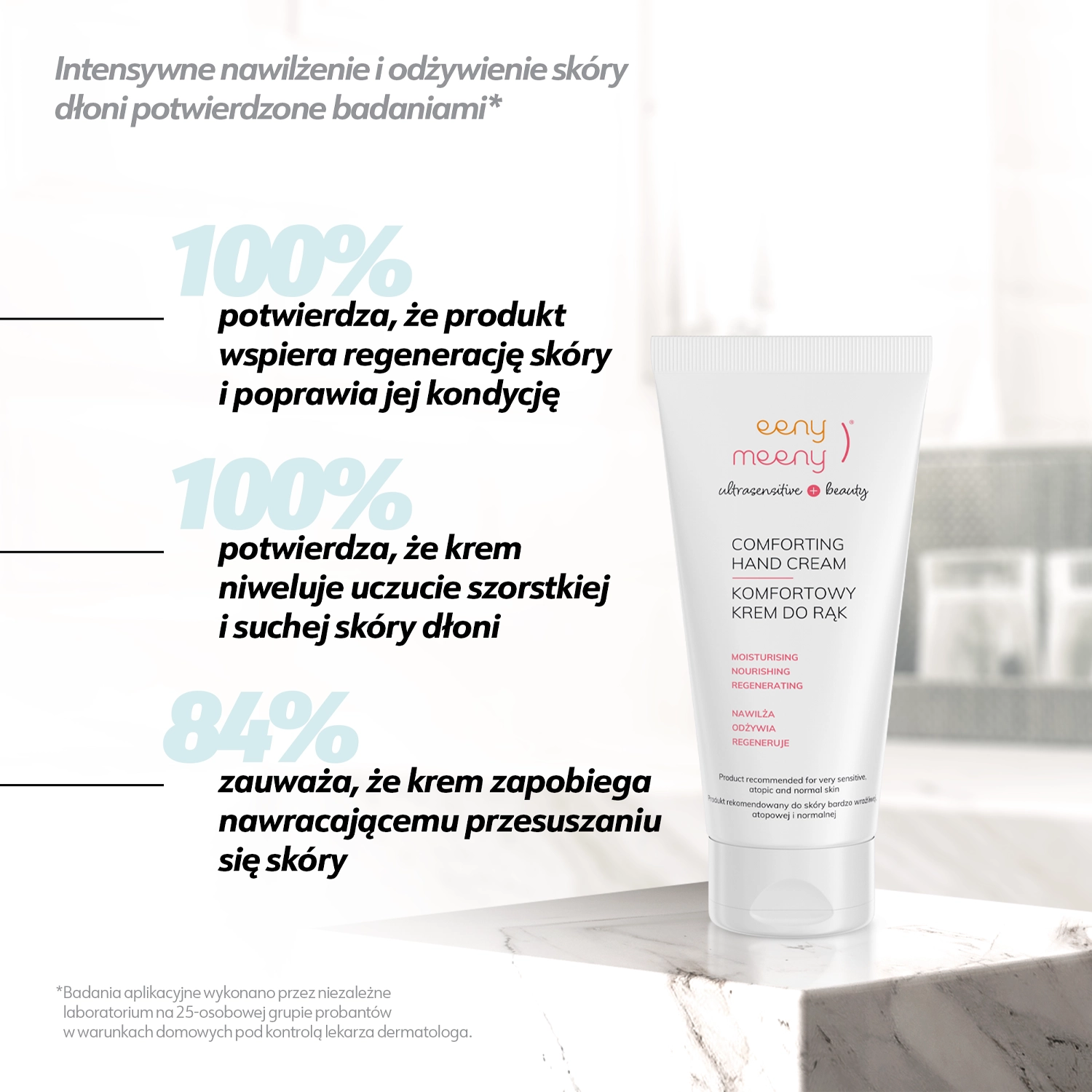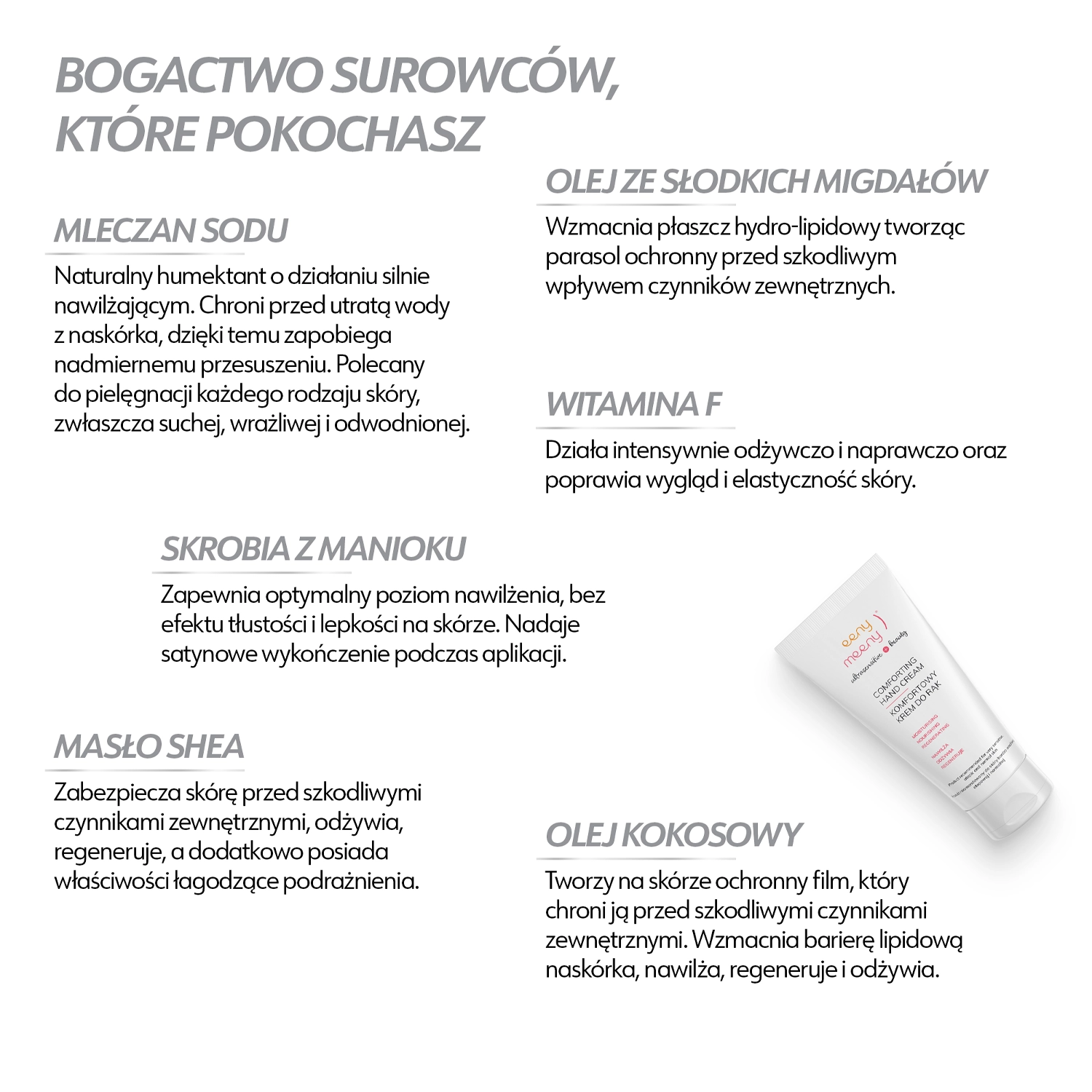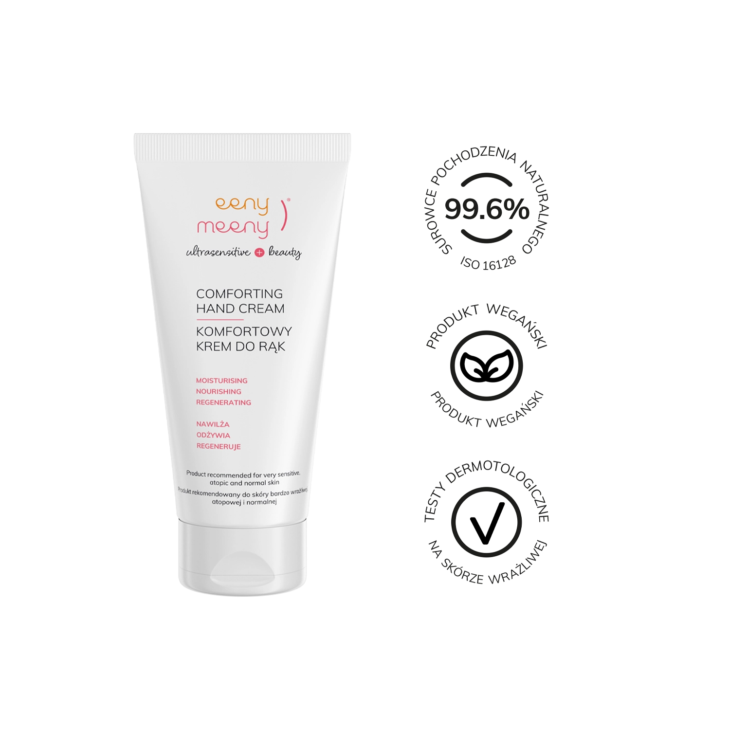 Eeny Meeny - Comforting Hand Cream - Pflegende Handcreme - eine Handcreme, die trockene und rissige Hände wirksam pflegt. Sie enthält Süßmandelöl und Kokosnussöl, um die Hautbarriere zu stärken, Sheabutter, um Reizungen zu lindern und die Haut zu regenerieren, und Senföl, um die Haut feucht und geschmeidig zu halten. Das Produkt hat eine angenehme, schnell einziehende Textur, die kein klebriges Gefühl hinterlässt. Es besteht zu 99,6 % aus Inhaltsstoffen natürlichen Ursprungs und ist für Veganer geeignet.