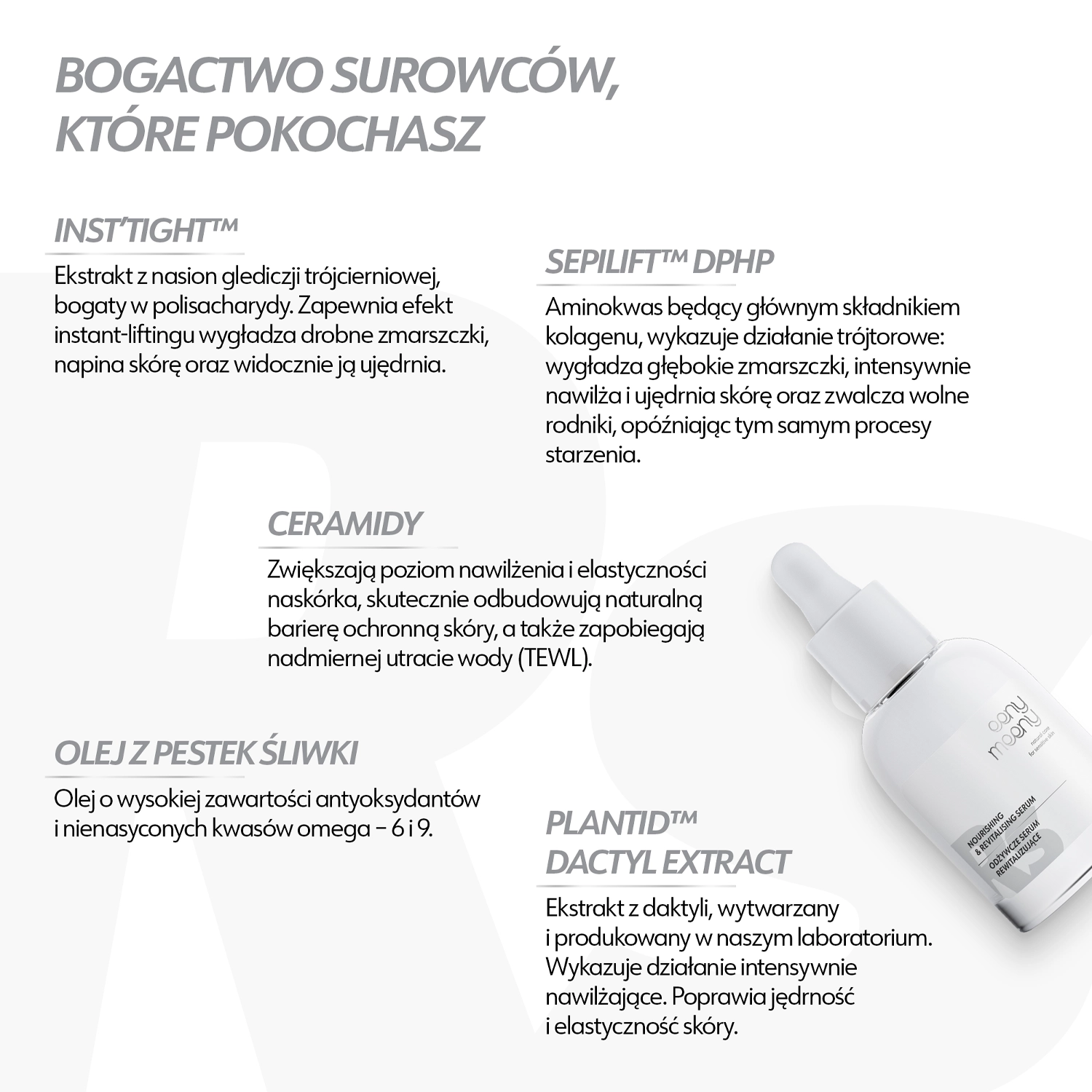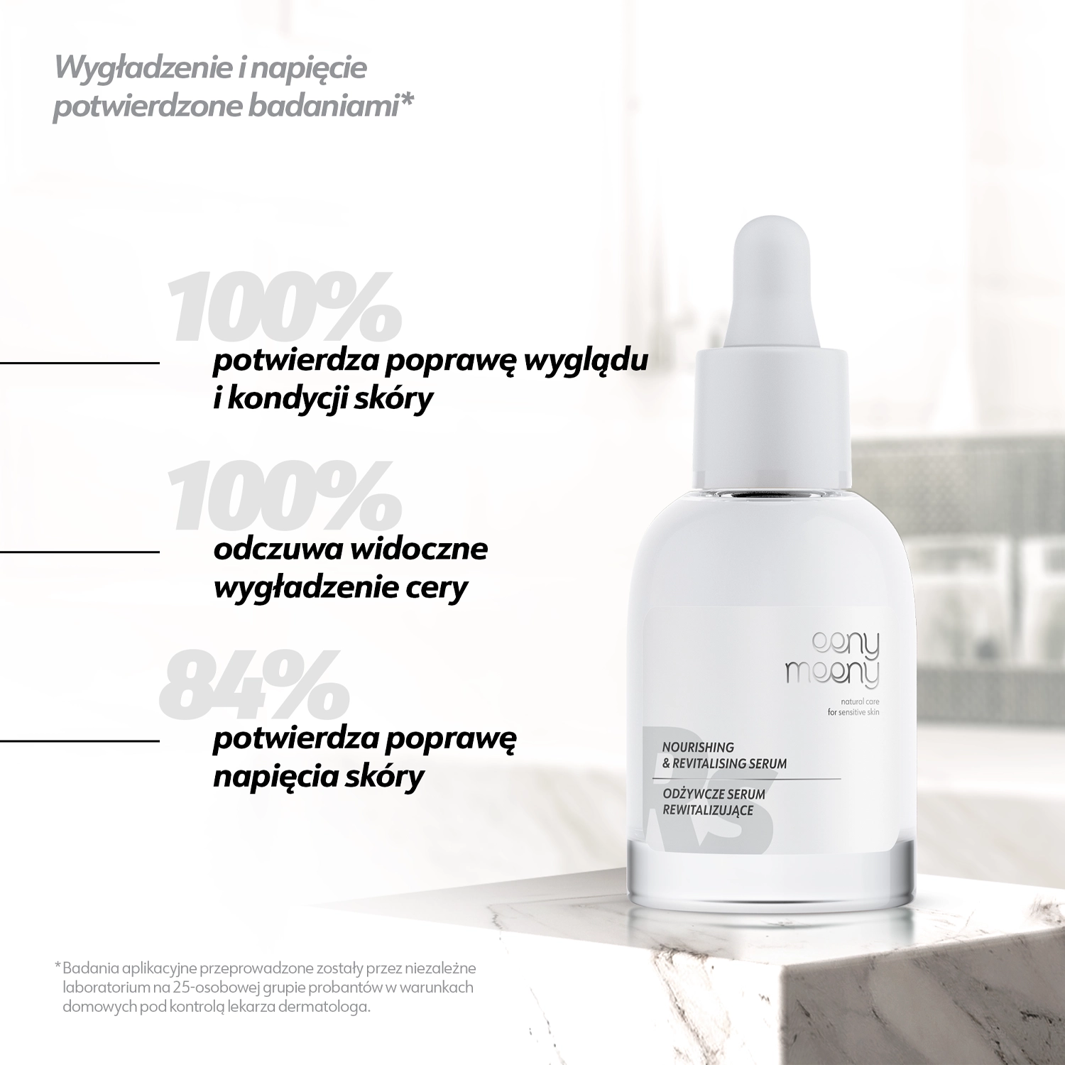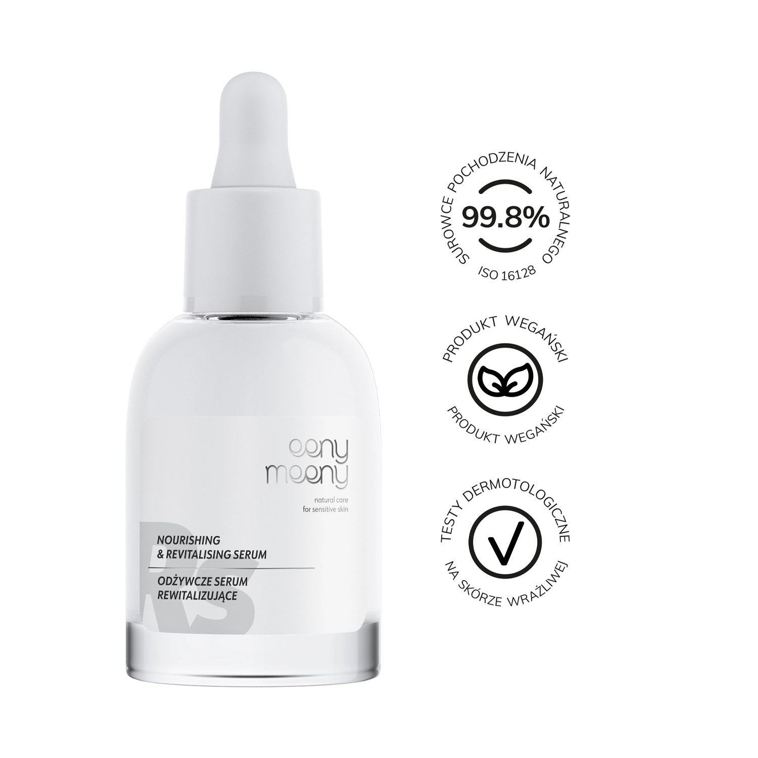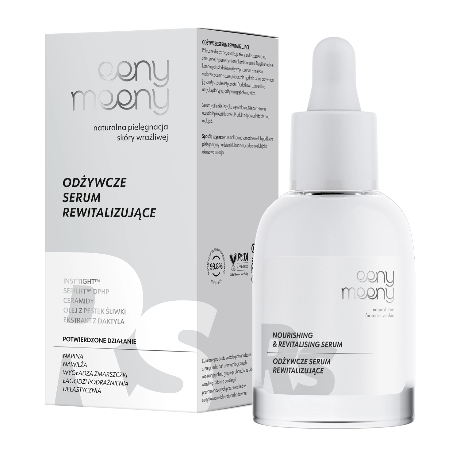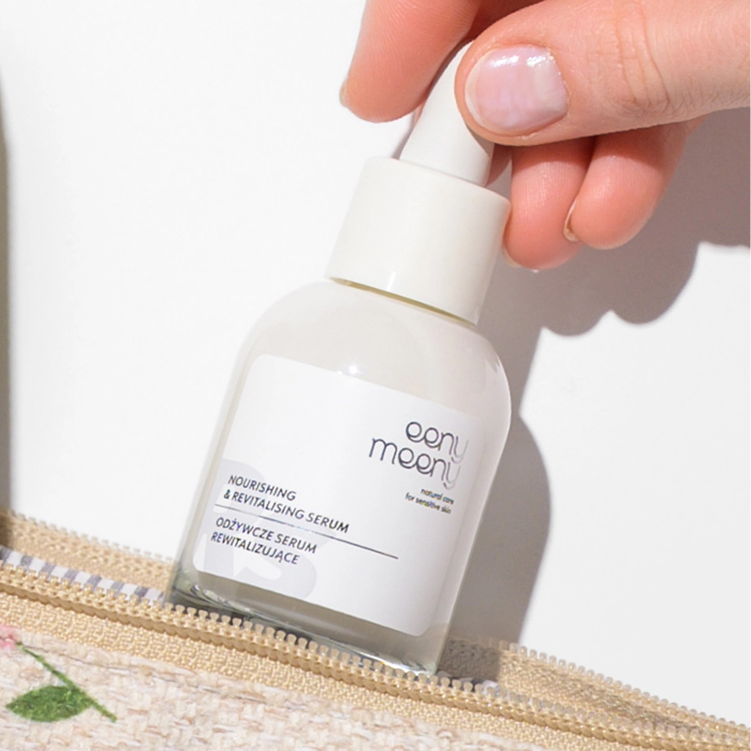 Eeny Meeny - Nourishing & Revitalising Serum - ein nährendes Serum mit einer milchig-emulsiven Textur, das für alle Hauttypen empfohlen wird, insbesondere für die regenerationsbedürftige Haut. Es hat einen unverwechselbaren Duft. Dank seines Gehalts an Ceramiden stärkt das Serum die Schutzbarriere der Haut, schützt vor Trockenheit und Irritationen und regeneriert die Haut. Hyaluronsäure bindet Wasser in der Epidermis, um die Haut mit Feuchtigkeit zu versorgen. Darüber hinaus unterstützen hydrolysierte Glykosaminoglykane die feuchtigkeitsspendende Wirkung des Produkts, machen die Haut weich und geschmeidig, straffen sie optisch und füllen feine Linien auf, um die Elastizität der Haut zu verbessern. Squalan nährt die Haut, während Pflaumenkernöl eine regenerierende und Anti-Aging-Wirkung hat. Dattel-Extrakt hingegen verbessert die Festigkeit und Elastizität der Haut und spendet intensiv Feuchtigkeit. Sie enthält 99,8% Inhaltsstoffe natürlichen Ursprungs.