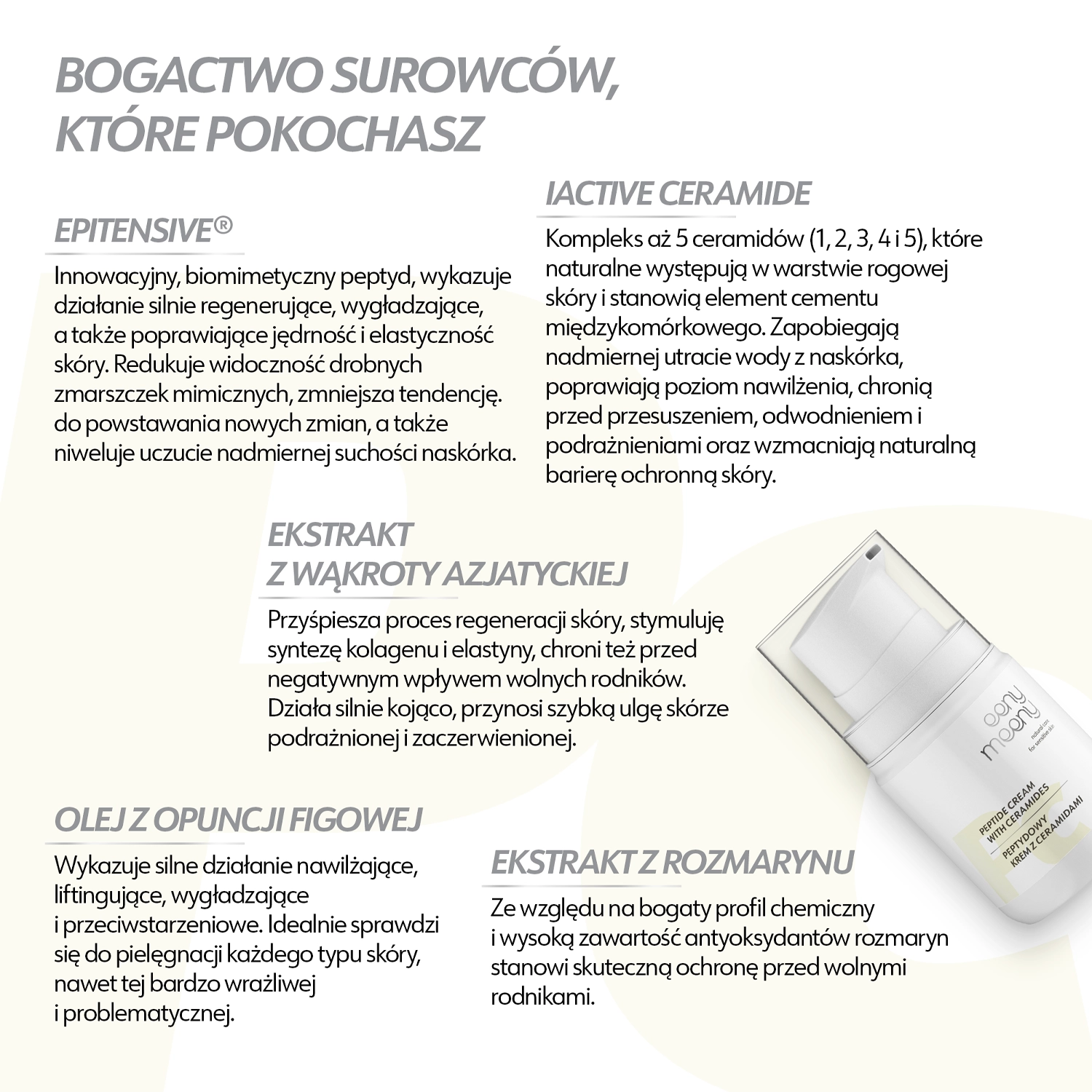 - EPITENSIVE® – eine Kombination aus Peptid und epidermalem Wachstumsfaktor, wirkt stark regenerierend, straffend und glättend, erhöht die Elastizität und verbessert die Dichte der Haut,