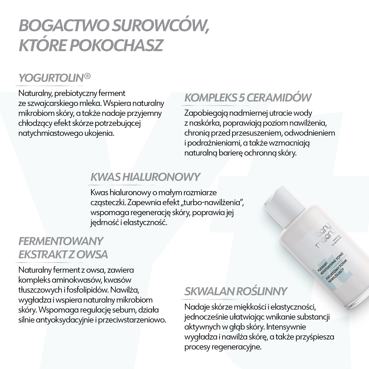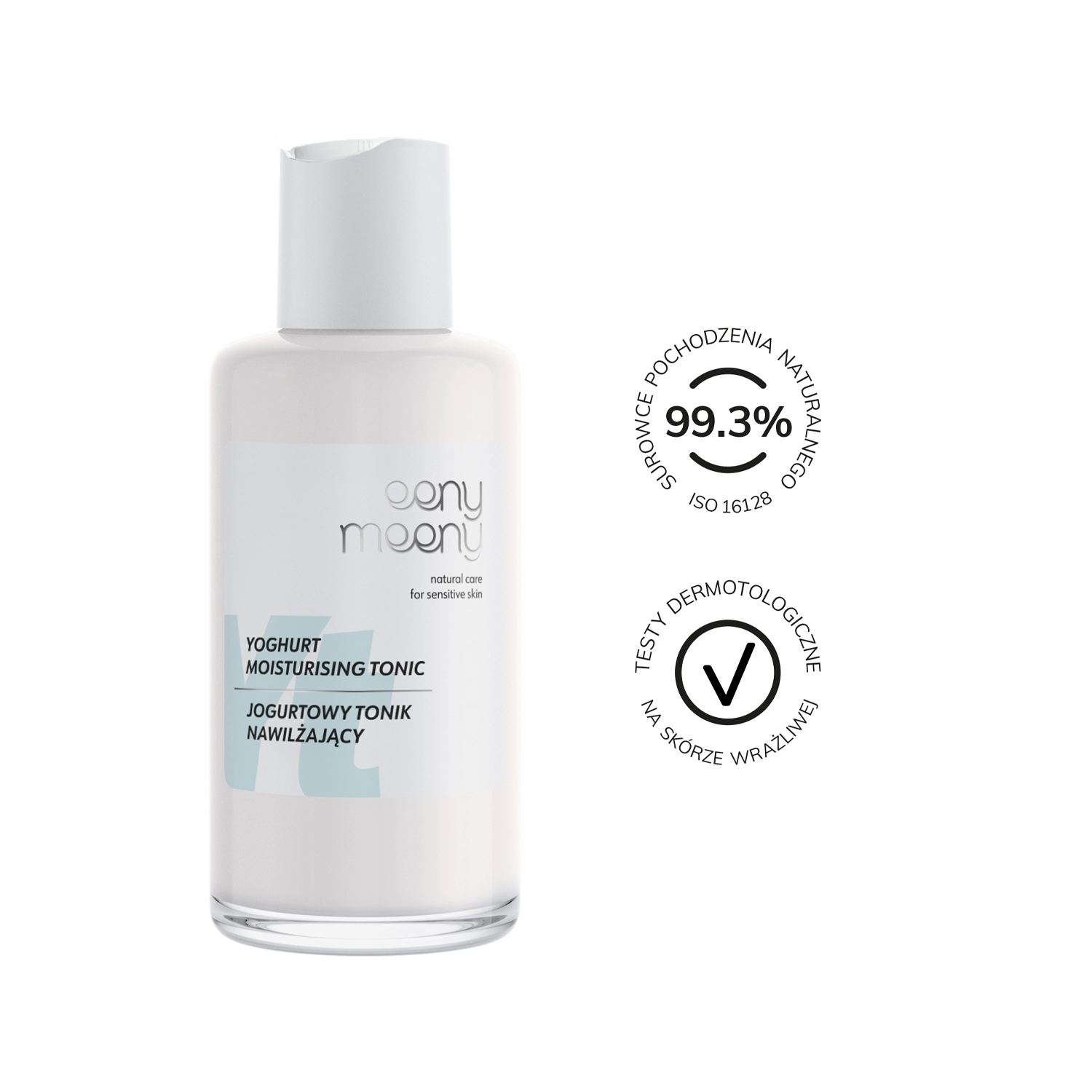 Eeny Meeny - Yoghurt Moisturising Tonic - ein Gesichtswasser für die tägliche Gesichtspflege, mit einer leichten und wässrigen Konsistenz. Das Tonikum reduziert den transepidermalen Wasserverlust aus der Epidermis. Es enthält Joghurt und ein Produkt der Milchsäurebakterienfermentation, was die Aufrechterhaltung eines angemessenen Mikrobioms und pH-Werts auf der Hautoberfläche fördert. Squalan und Baumwollsamenöl unterstützen die natürliche Hydrolipidbarriere. Kokosnusssaft spendet sanft Feuchtigkeit und hat wertvolle antioxidative Eigenschaften, ebenso wie Rhabarberextrakt. Preiselbeerextrakt hingegen gleicht den Hautton aus. Das Gesichtswasser ist parfümfrei und hat daher eine sanfte Formel, die auch für empfindliche Haut geeignet ist. Das Kosmetikprodukt ist 100% natürlich.