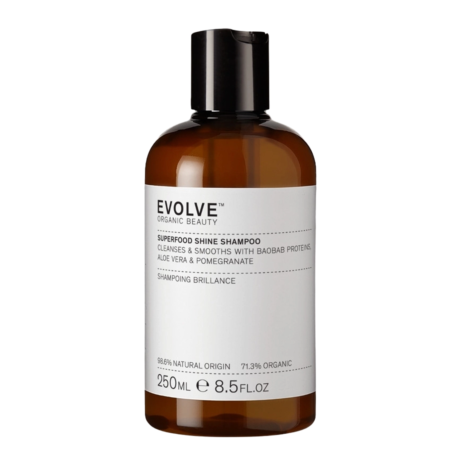 Evolve Organc Beauty - Superfood Shine Shampoo - ist ein natürliches, glänzendes Shampoo für das Haar. Es reinigt die Kopfhaut sanft, ohne sie zu reizen. Es enthält Baobab-Samenprotein, das die Lücken im Haar auffüllt und es nährt. Außerdem enthält es Granatapfelextrakt, der die Kopfhaut reinigt und den Talg reguliert, sowie Aloe-Vera-Blattmark, das beruhigende, feuchtigkeitsspendende, weichmachende und antibakterielle Eigenschaften besitzt. Das Produkt ist für Veganer geeignet und steht im Einklang mit dem Konzept der Abfallvermeidung.