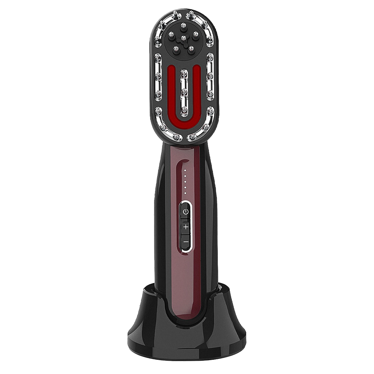 Anwendung: 1. Pflege der Haare und Kopfhaut: Um das Gerät einzuschalten, drücken und halten Sie die Ein-/Aus-Taste, bis Sie eine Vibration spüren. Das Gerät startet automatisch im Modus 1, also mit der niedrigsten Leistungsstufe. Den Modus wechseln Sie durch kurzes Drücken der Ein-/Aus-Taste. Zum Ausschalten halten Sie die Taste erneut gedrückt, bis Sie eine Vibration spüren. Mit der Taste "+" erhöhen Sie schrittweise die Leistung (von Stufe 1 bis 5), mit der Taste "-" verringern Sie diese (von Stufe 5 bis 1). Vor der Anwendung stellen Sie sicher, dass Ihre Kopfhaut sauber und trocken ist und das Haar sorgfältig gekämmt wurde. Führen Sie während der Anwendung die Bürstenzähne langsam in Zickzackbewegungen über die Kopfhaut. Beginnen Sie mit der niedrigsten Leistungsstufe und erhöhen Sie diese schrittweise, je nach individuellem Komfort. Achten Sie darauf, dass alle Metallzähne der Bürste konstanten Kontakt mit der Kopfhaut haben, vermeiden Sie jedoch zu starken Druck, der Reizungen oder Hautschäden verursachen könnte. Führen Sie die Bürste vertikal entlang der Kopfhaut mit mäßigem Druck. Die Behandlung sollte alle 2-3 Tage erfolgen und nicht länger als 5 Minuten dauern. Achten Sie bei jeder Anwendung darauf, alle Bereiche der Kopfhaut zu massieren, damit das rote und blaue Licht gleichmäßig auf die gesamte Haut wirken kann. Bei der ersten Anwendung empfiehlt es sich, mit dem niedrigsten Modus zu beginnen und die Einstellungen dann schrittweise an die eigenen Bedürfnisse anzupassen. 2. Gesichtspflege: Tragen Sie auf die gründlich gereinigte Gesichtshaut ein Serum, eine Ampulle oder ein anderes leitfähiges Kosmetikum auf. Schalten Sie dann das Gerät ein, wählen Sie den passenden Modus und starten Sie mit der niedrigsten Leistungsstufe. Erhöhen Sie die Intensität schrittweise, bis Sie ein angenehmes Gefühl haben. Legen Sie den Aufsatz so an die Gesichtshaut an, dass er vollständig aufliegt, und bewegen Sie ihn langsam von der Gesichtsmitte zu den äußeren Partien, in sanften, fließenden Bewegungen. Vermeiden Sie während der Anwendung die Augenpartie, den Mund, die Nase sowie den Bereich der Schilddrüse. Die Behandlung sollte in Serien von 6 bis 10 Sitzungen alle 2-3 Tage durchgeführt werden. Die Behandlungsdauer sollte jeweils 10 Minuten nicht überschreiten. 3. Körperpflege: Tragen Sie auf die saubere Haut ein Serum, eine Ampulle oder ein anderes leitfähiges Kosmetikum auf, um die Wirkung zu intensivieren. Schalten Sie dann das Gerät ein und legen Sie den Aufsatz auf den gewünschten Körperbereich. Beginnen Sie mit der niedrigsten Leistungsstufe und erhöhen Sie die Intensität schrittweise, bis das Gefühl angenehm bleibt. Führen Sie den Aufsatz während der Behandlung von unten nach oben, in Richtung Herz. Im Bauchbereich führen Sie sanfte Kreisbewegungen von den äußeren Bereichen zum Nabel. Achten Sie darauf, dass die Elektrode während der gesamten Anwendung eng an der Haut anliegt, um eine effektive und sichere Wirkung zu gewährleisten.