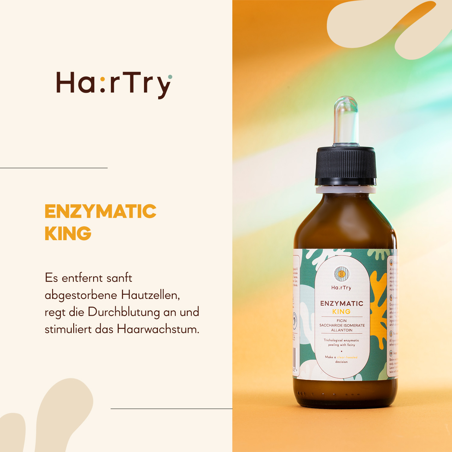 HairTry - Enzymatic King - ein trichologisches Kopfhaut-Peeling mit mittlerer Peeling-Kraft. Es hat eine leichte, emulgierende Formel und einen subtilen und frischen Meeresbrise-Duft. Speziell entwickelt für die Haut, die gereinigt und gleichzeitig mit Feuchtigkeit versorgt werden muss und mit Trockenheit und Juckreiz zu kämpfen hat. Dank des Inhalts eines aus Feigen gewonnenen Enzyms - Ficin- reinigt es die Kopfhaut perfekt und entfernt abgestorbene Hautzellen. Ficin ist ein 20-mal stärkeres Enzym als Papain. Das Peeling bekämpft die trockene Nagelhaut, reinigt die Haarfollikel und regt die Blutzirkulation an, was zu besseren Bedingungen für das Haarwachstum führt. D ie Zusammensetzung wird durch Saccharid-Isomerat, Allantoin und Squalan vervollständigt , died ieKopfhaut tiefgehend befeuchten und beruhigen sowie hartnäckigen Juckreiz lindern. Die Verpackung des Peelings ist eine Glasflasche mit einer Pipette für eine bequeme Anwendung. Mit dem Kauf dieses Produkts unterstützen Sie die Stiftungen Seedballs Kenya und ReSea Project.