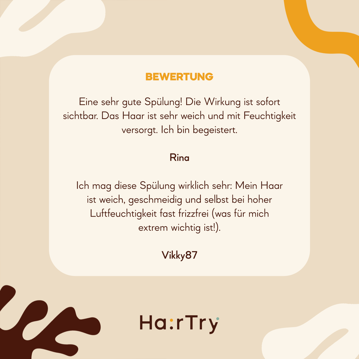 Anwendung: Der Conditioner auf das shampoonierte Haar auftragen und überschüssiges Wasser entfernen. Kämmen Sie das Produkt mit einer Bürste oder einem Kamm mit breiten Zähnen ein. Einige Minuten einwirken lassen und dann mit Wasser ausspülen.