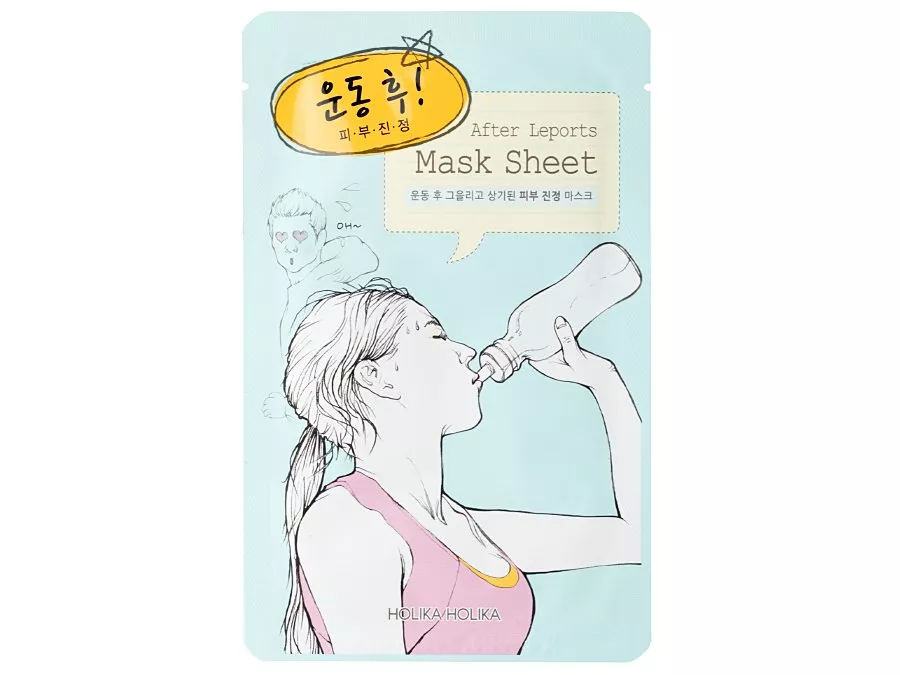 Holika Holika - After Mask Sheet - After Working Out - Die Maske besteht aus einem dünnen, mit wertvollen Wirkstoffen getränkten Baumwollblatt, das sich perfekt an die Gesichtsform anpasst. Sie enthält Bambusextrakt, der antioxidative und feuchtigkeitsspendende Eigenschaften hat, und Aloe Vera Extrakt, der lindert und die Regenerationsprozesse der Epidermis stimuliert. Das Produkt enthält außerdem Trehalose und Natriumhyaluronat, die die Hautfeuchtigkeit wirksam verbessern, sowie Allantoin, das beruhigend und reizlindernd wirkt. Die Maske hilft, die Haut zu regenerieren und zu erfrischen und ist daher ideal für die abendliche Pflege nach dem Training, wenn die Haut dies besonders benötigt.