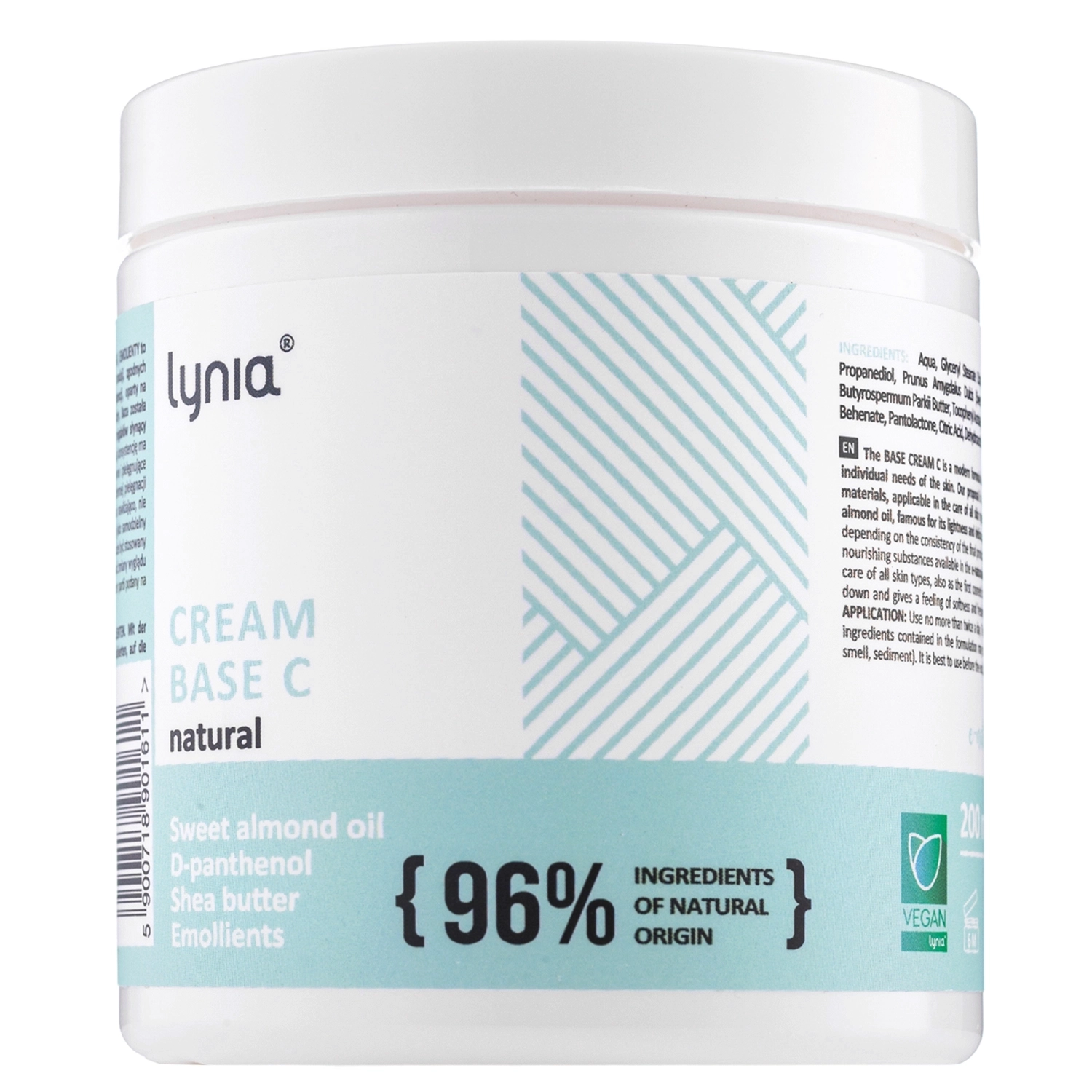 Lynia - Cream Base C Natural - Leichte feuchtigkeitsspendende Basiscreme mit den Vitaminen B5 und E - eine Basiscreme mit leichter Konsistenz auf Basis natürlicher Rohstoffe zur Pflege aller Hauttypen. Die Basis wurde mit Panthenol und Vitamin E angereichert. Zur Herstellung wurde Süßmandelöl verwendet, das für seine Leichtigkeit und Zartheit bekannt ist. Es spendet Feuchtigkeit, belastet die Haut nicht und verleiht ein Gefühl von Weichheit und Frische. Die Basiscreme kann als eigenständige Kosmetik verwendet werden.