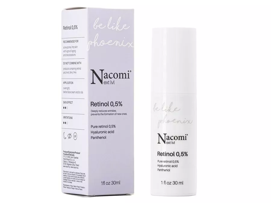 Nacomi - Next Level - Retinol 0,5% - Serum mit Retinol 0.5% - Serum mit 0.5% Vitamin A in Form von Retinol. Dieser Wirkstoff ist bekannt für seine starken Anti-Aging-Eigenschaften. Retinol hat die Fähigkeit, die Fibroblasten zur Produktion von Kollagen anzuregen, was zu einer erhöhten Festigkeit der Haut und zur Glättung von Fältchen führt. Es unterstützt die Bekämpfung von Akne und reguliert die Talgsekretion. Der Zusatz von vier unterschiedlich großen Formen von Hyaluronsäure sorgt für einen angemessenen Feuchtigkeitsgehalt, während Panthenol die gereizte Haut lindert und das irritierende Potenzial von Retinol reduziert. Das Serum glättet die Haut, hat eine Anti-Ageing-Wirkung und mildert auch Akne-Symptome. Die luftlose Verpackung erleichtert die richtige Menge des Produkts. Die gesamte Formel wurde aus Rohstoffen natürlichen Ursprungs zusammengestellt.