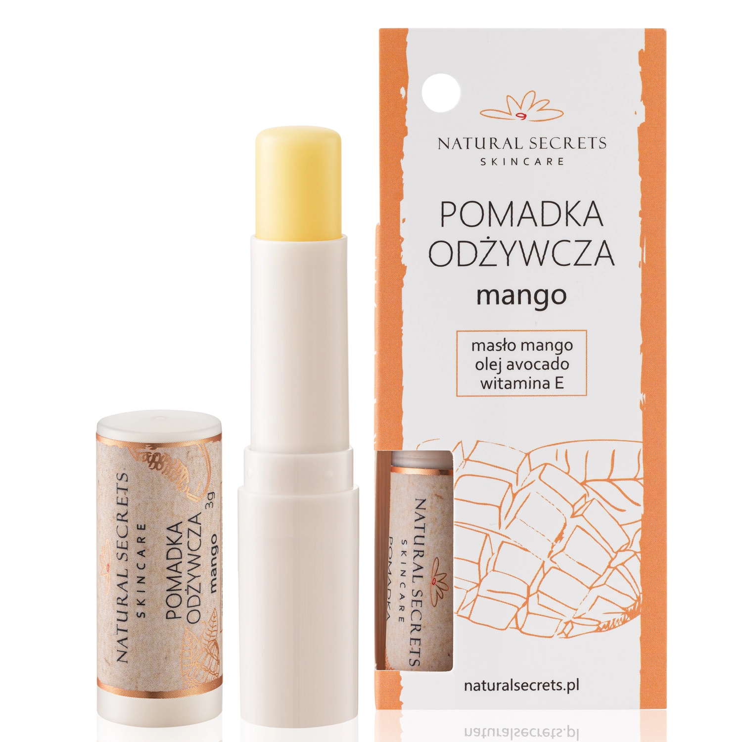 Natural Secrets - Schutzender Lippenpflegestift - Mango – ein nährender Lippenpflegestift auf Basis von Emollientien. Er umhüllt die Lippen mit einer schützenden, nährenden Schicht, die die Regeneration der Haut unterstützt. Die Formel mit Mango-Butter, Lanolin und Bienenwachs pflegt die Lipidschicht der Epidermis und legt einen Schutzfilm darüber, der die Lippenränder vor schädlichen Witterungseinflüssen schützt. Der Lippenpflegestift zieht schnell ein und hinterlässt kein unangenehm fettiges Gefühl auf den Lippen. Das zugesetzte Mango-Aroma sorgt für ein angenehmes Anwendungserlebnis. Polnisches Produkt.