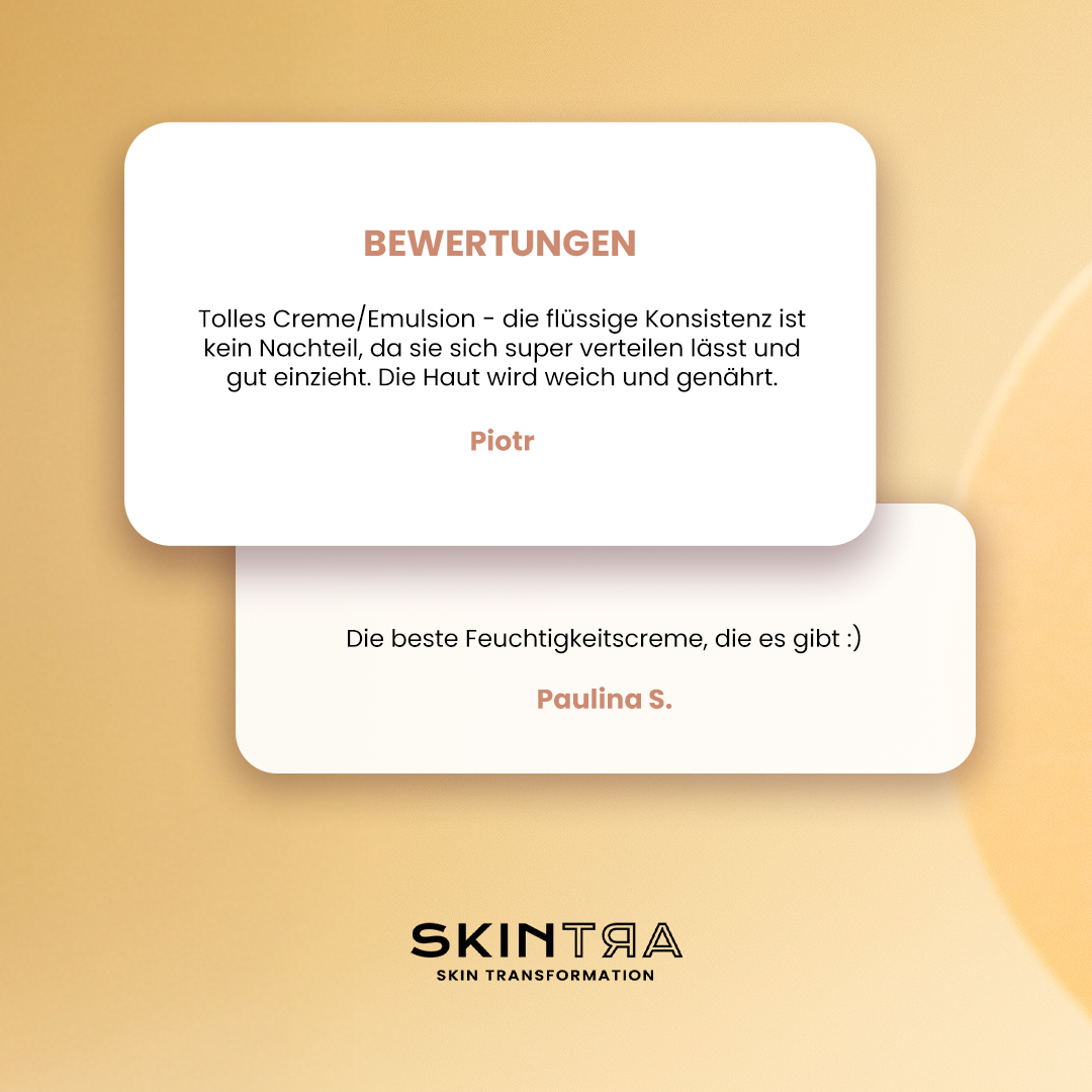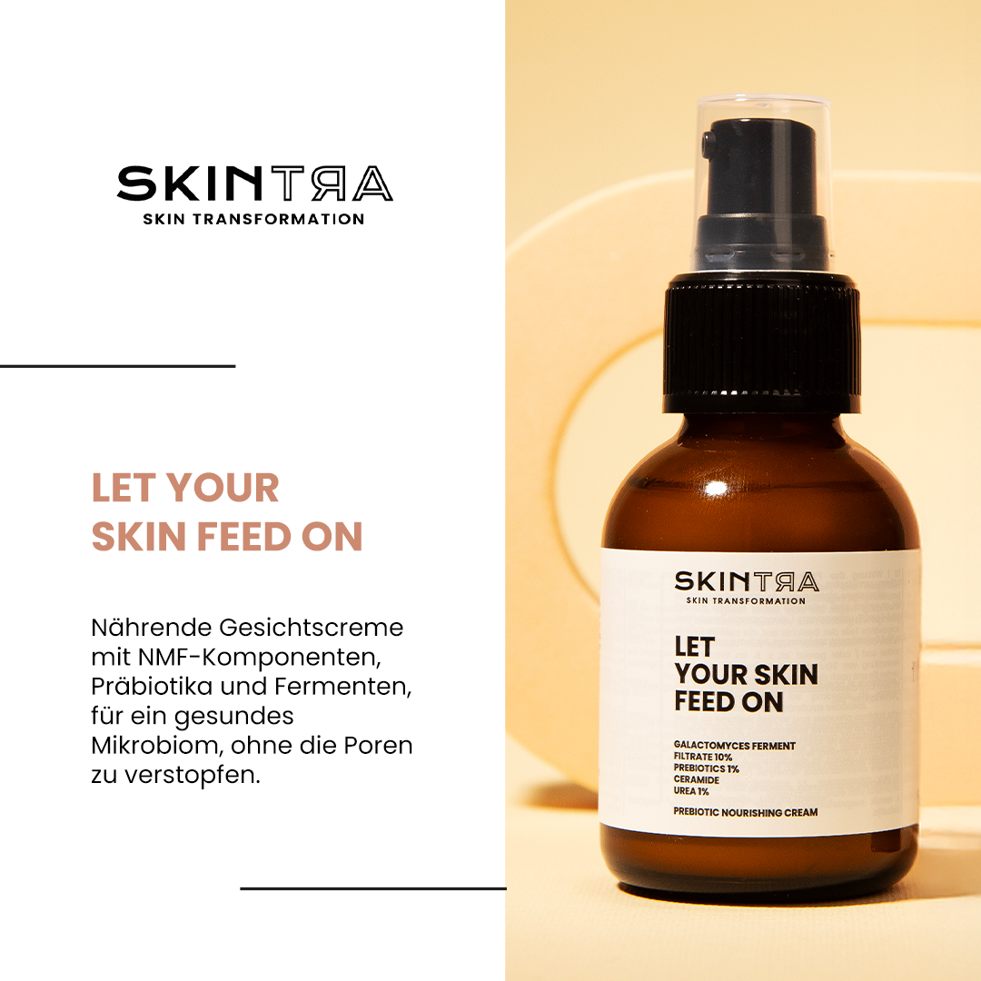 SkinTra - Let Your Skin Feed On - eine leichte Nähcreme mit breitem Pflegespektrum. Empfohlen vor allem für Menschen, deren Haut eine starke Feuchtigkeitsversorgung benötigt und gleichzeitig keine "butterartigen" Formeln mag. Es enthält NMF-Inhaltsstoffe, also den Natural Moisturizing Factor (natürlichen Feuchtigkeitsfaktor), sowie Präbiotika und Fermente, die das Gleichgewicht des Mikrobioms wiederherstellen. Auf physiologische und aktive Weise spendet es der Haut tiefenwirksam Feuchtigkeit und regeneriert sie. Die enthaltenen Inhaltsstoffe ergänzen Mangeln, die chronische oder vorübergehende Trockenheit verursachen, stellen so den entsprechenden Feuchtigkeitsgehalt wieder her und verhindern ein wiederholtes Austrocknen. Antioxidative und entzündungshemmende Stoffe beschleunigen die Regenerationsmechanismen. Die Rezeptur wurde so zusammengestellt, dass das komedogene Potenzial weitgehend reduziert und gleichzeitig verbesserte Nährwerte generiert werden. Schon nach wenigen Anwendungen sehen Sie die volle Bandbreite der Eigenschaften, die lange halten.