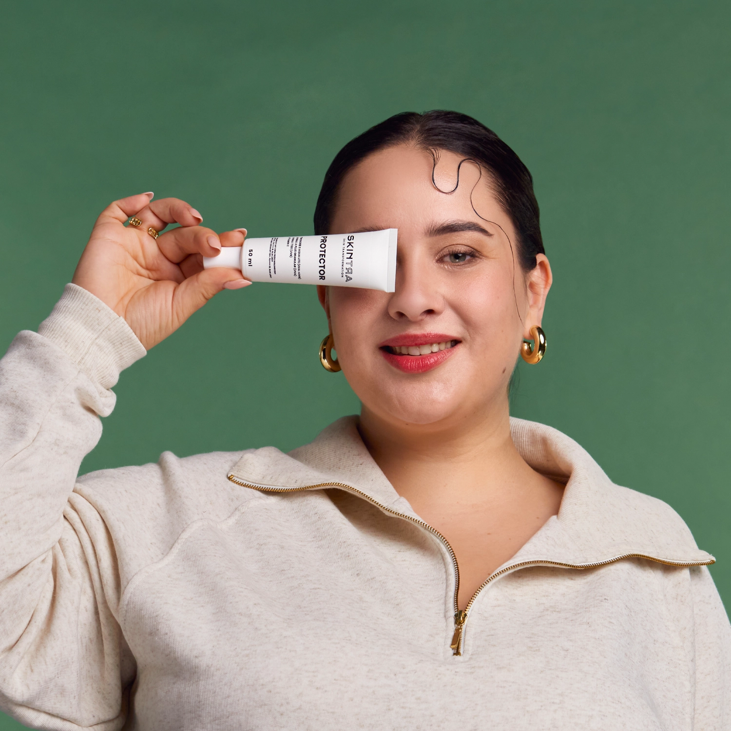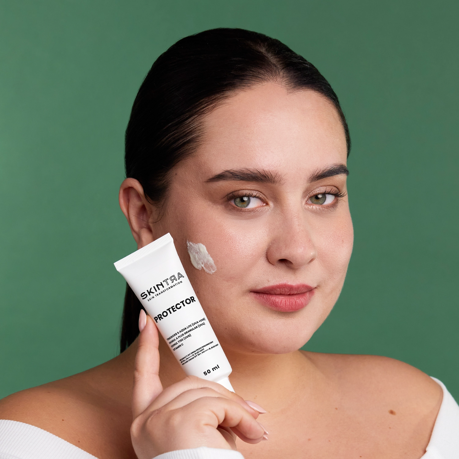 SkinTra- Protector - eine vollständige Creme, die ganzjährigen Sonnenschutz mit aktiver Vorbeugung gegen Hautalterung verbindet. Sie hat eine Emulsionsformel, die für alle Hauttypen geeignet ist, und kann im Gesicht und am ganzen Körper angewendet werden. Die Creme kann in der Augenpartie verwendet werden, was von einem Augenarzt bestätigt wurde. Das Produkt hat eine angenehme Formel mit einem seidigen Finish, es verleiht der Haut ein gesundes und strahlendes Aussehen. Es erzeugt keinen bleichenden, rollenden Effekt und brennt auch nicht in die Augen. Die in der Formel verwendete Breitbandfilter bieten unabhängig von der Jahreszeit einen sehr hohen Schutz vor einer breiten Palette von Strahlungen. Die verwendeten Inhaltsstoffe schützen aktiv vor den negativen Auswirkungen von blauem Licht und infraroter IR-Strahlung. Sie schützen vor freien Radikalen und damit vor vorzeitiger Alterung und Schädigung des interzellulären Zements, die zu Trockenheit und Reizungen der Haut führen können. Wichtig ist, dass das Produkt nicht nur aufgrund der verwendeten chemischen Filter, sondern auch aufgrund des Vitamin-C-Gehalts vor der Bildung von Verfärbungen und Rötungen schützt. Weitere Inhaltsstoffe sorgen dafür, dass der Feuchtigkeitsgehalt der Haut konstant auf einem hohen Niveau gehalten wird. Der PPD-Wert beträgt 23,8.