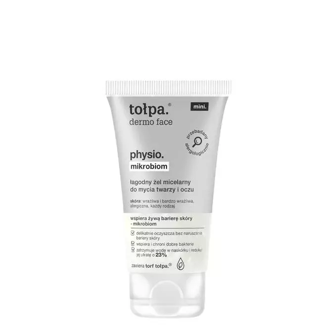 Tołpa - Dermo Face Physio Microbiome - Sanftes Mizellen-Gel für Gesicht und Augenreinigung - Mini - ein Make-up-Entferner für Gesicht und Augen in Gelform. Es enthält milde Reinigungssubstanzen zur Säuberung der Haut. Zusätzlich fördert das probiotische Bifida Ferment Lysat die Aufrechterhaltung eines normalen Mikrobioms auf der Hautoberfläche. Wertvoller Torfextrakt wirkt reinigend, erfrischend und entgiftend und macht freie Radikale unschädlich, während Natriumhyaluronat die Hautfeuchtigkeit verbessert.